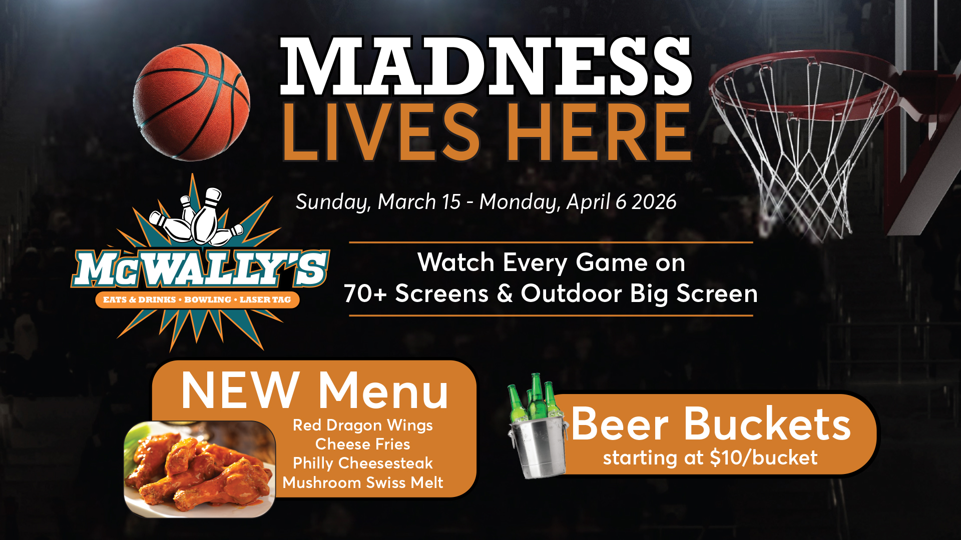 Catch every jump shot, clutch buzzer-beater, and unforgettable moment of college basketball—from opening tip-off to the thrill of March. Whether you bleed your school’s colors or just love the electric energy of the game, our spot is the ultimate hangout to celebrate every basket and buzzer beater!